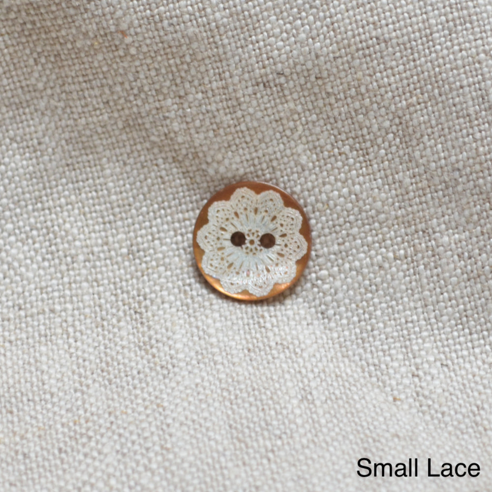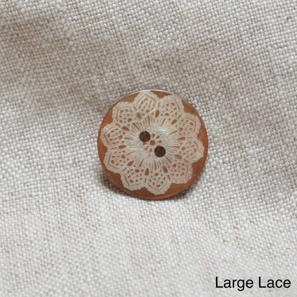 The Large Lace buttons measure 22mm / 7/8" and the Small Lace buttons measure 15mm / 4/8".