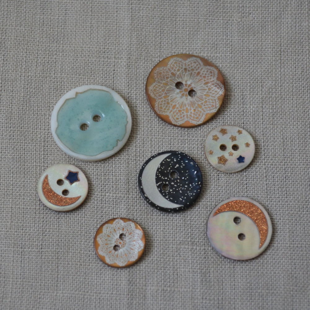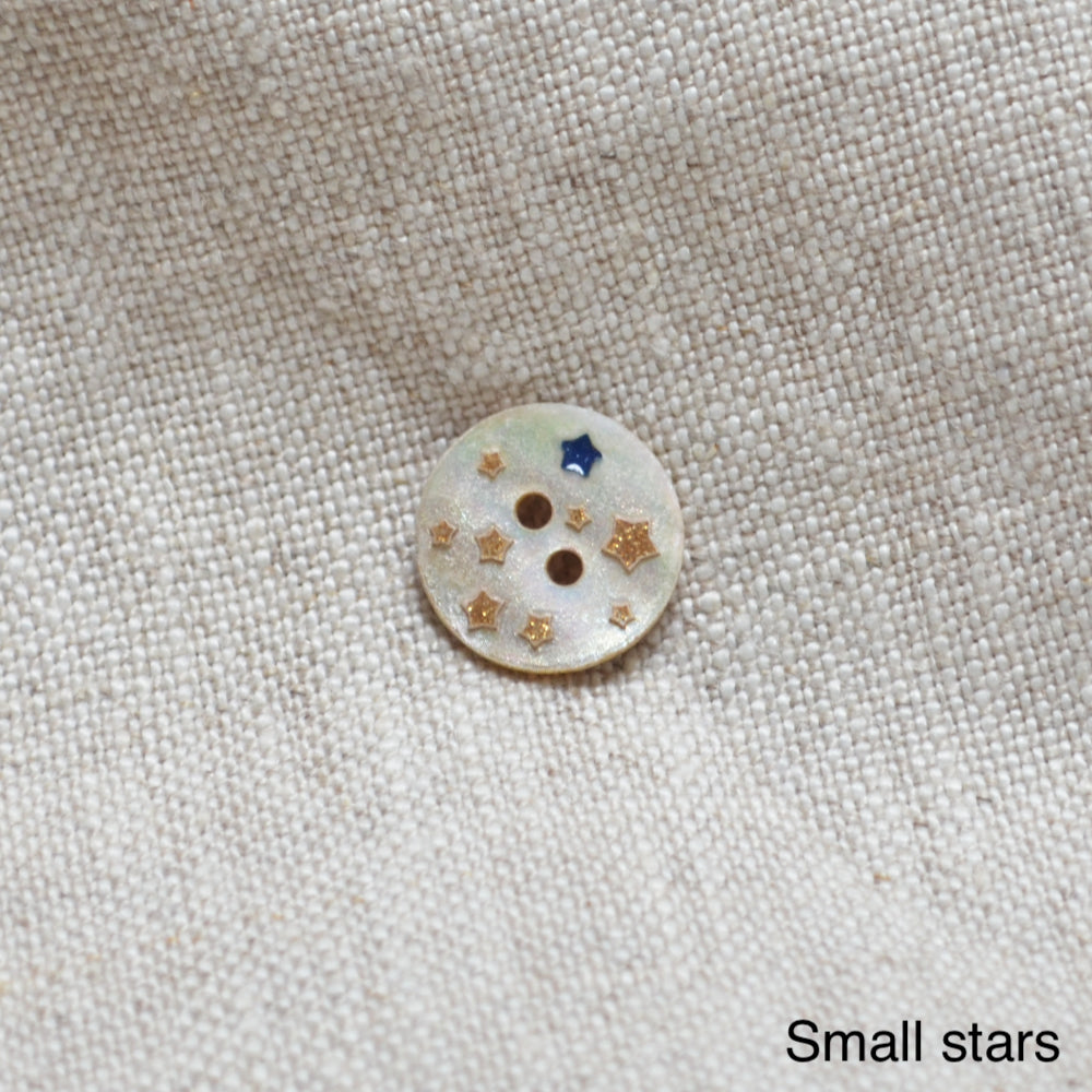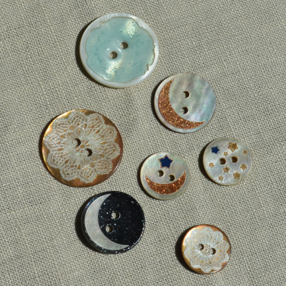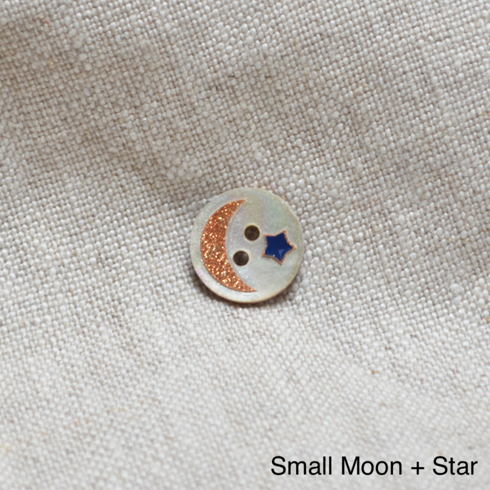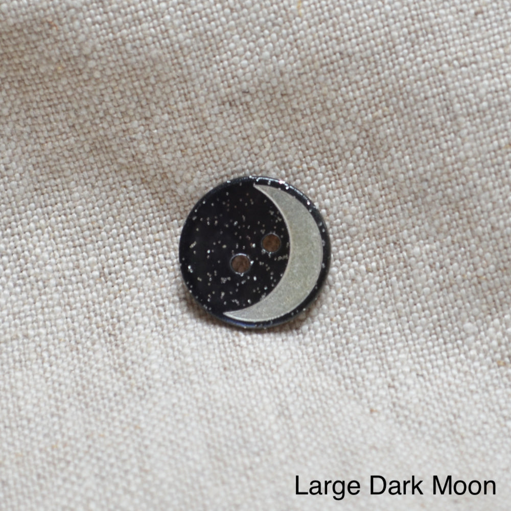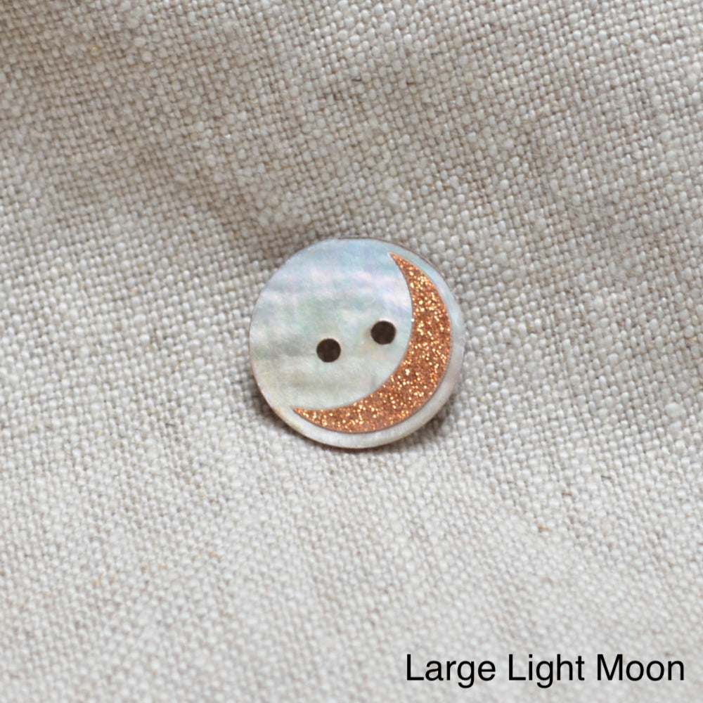The Large Dark and Large Light Moon buttons measure 18mm / 6/8". The small Moon + Star and Stars buttons measure 15mm / 4/8".