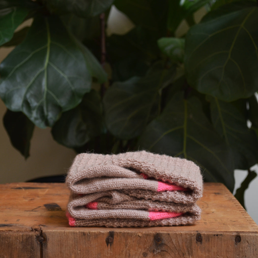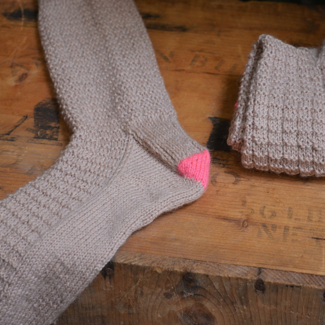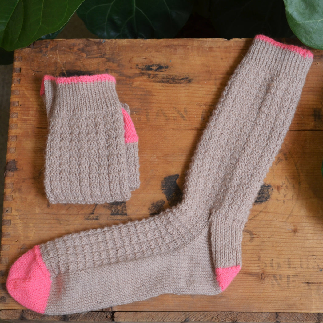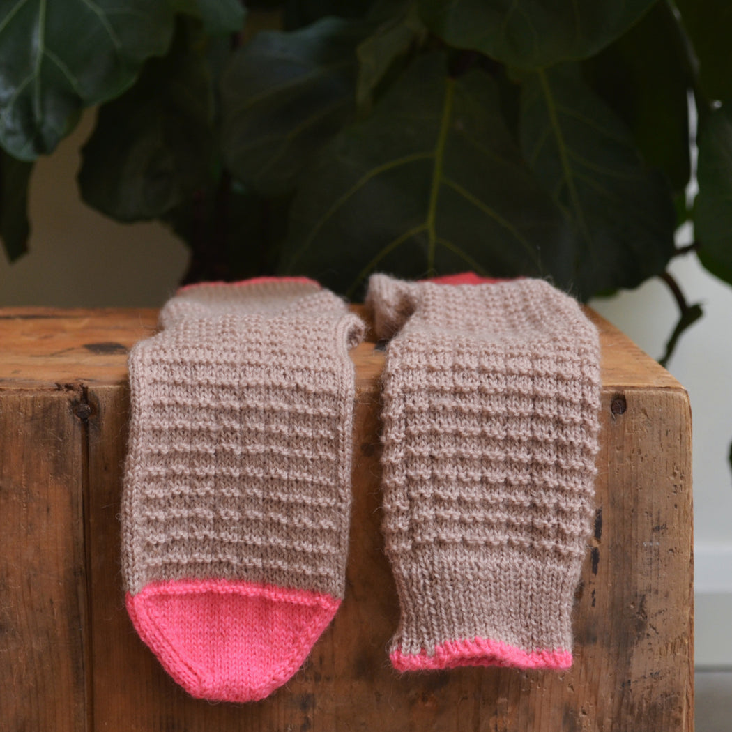 We find that Perennial is slightly lighter than a standard sock weight fingering yarn, so a 2.25mm needle (for small circumference knitting) is ideal, but the squishy texture of waffle stitch is very accommodating- feel free to size up or down a needle size to suit your personal fit preference.