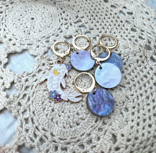 Jenn Augstman's beautiful stitch markers are handmade with resin pendants on removable 'bulb' stitch markers, suitable for knitting and crocheting. They can accommodate up to an 8mm needle.