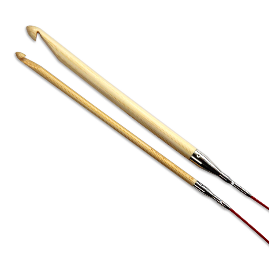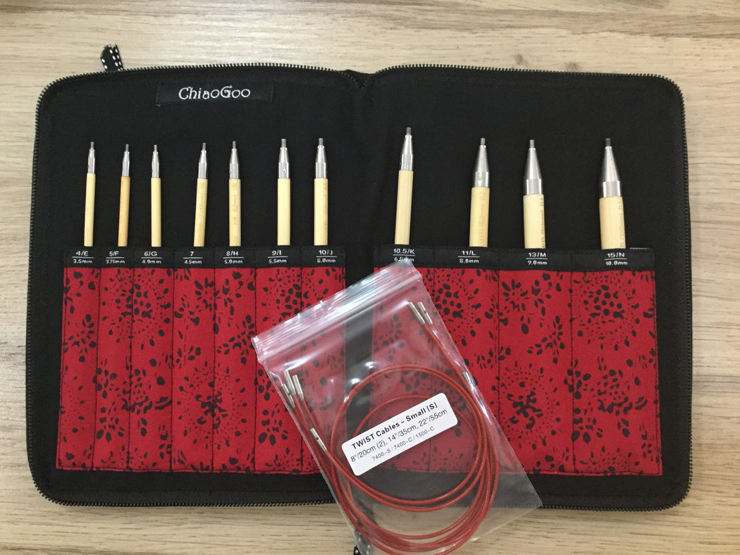Bamboo Tunisian interchangeable set comes with the following: 11 5.7” (14.5cm) hooks in sizes E/4 (3.5mm) – N/15 (10mm), including size 7 (4.5mm); 4 TWIST [S] red cables (two 8″/20cm, one 14″/35cm and one 22″/55cm); 4 end stoppers, 4 adapters, 2 connectors, tightening keys and a needle gauge; zippered case very similar in design to our current interchangeable cases. The hooks are made of Moso bamboo, have a pointy head to get into your stitches and a stainless steel join. The size is permanently laser marked on each hook. Size I (5.5 mm) and larger hooks will fit the [S] cables with the use of an adapter. Compatible with SPIN cables.