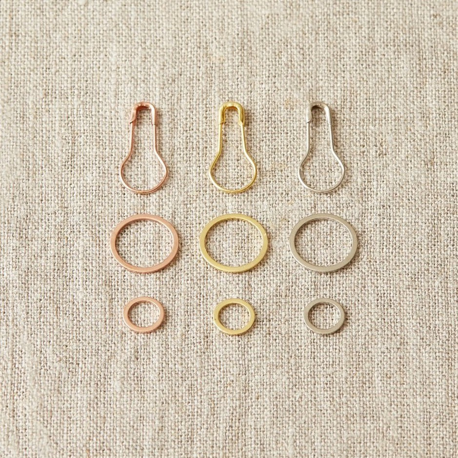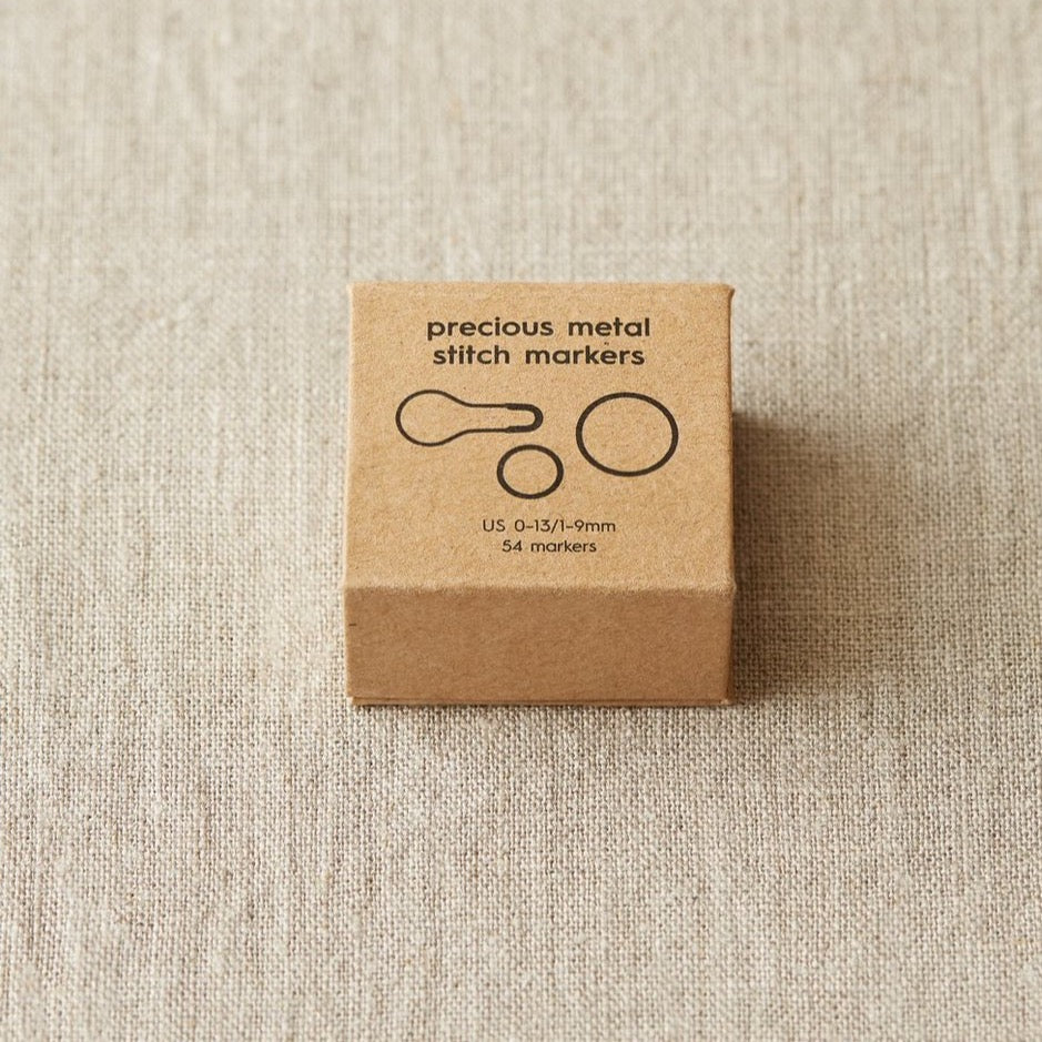 A sweet little box of precious metal stitch markers, finished in gold, silver and copper over steel. Each kraft box with magnetic lid holds 54 stitch markers.