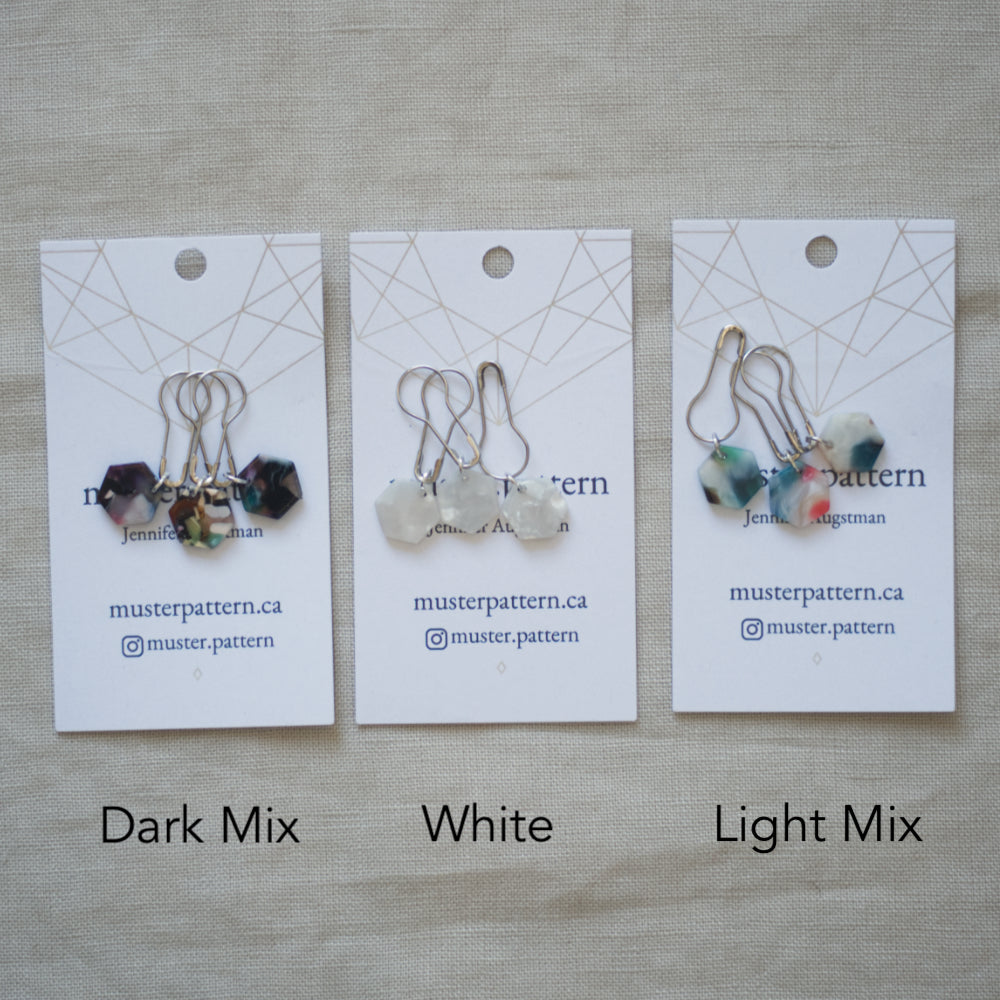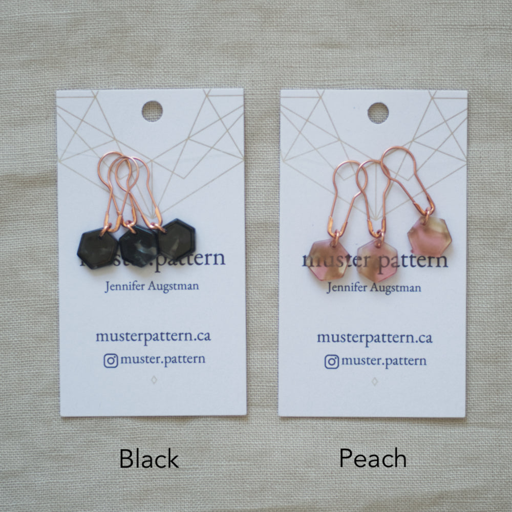 These beautiful stitch markers are made here in Hamilton by Muster Pattern. Each package comes with three resin stitch markers attached to a locking metal stitch marker. The item name tells you the resin colour and the stitch marker colour. Markers come in Silver or Rose gold.