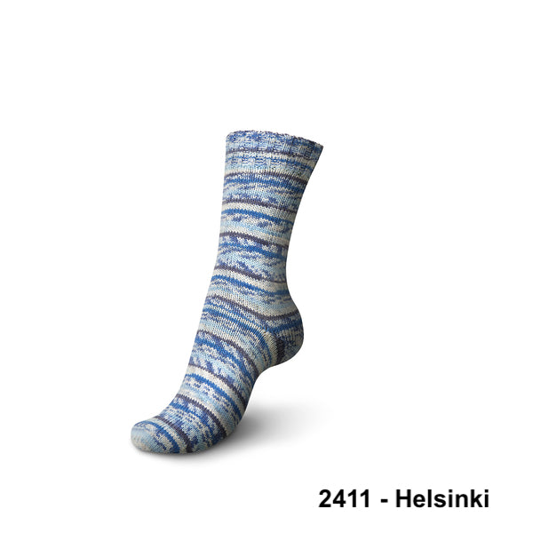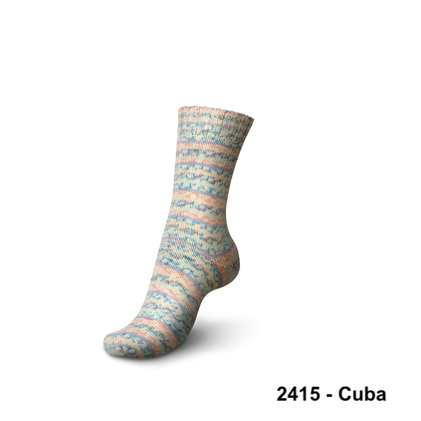 Project Suggestions: Choose a simple cuff down or toe up sock pattern, and let the self patterning yarn do all the work of making your socks look fantastic. For a simple cuff down pattern, our staff members love Very Vanilla Socks by Jo-Anne Klim, or A Nice Ribbed Sock by Glenna C.