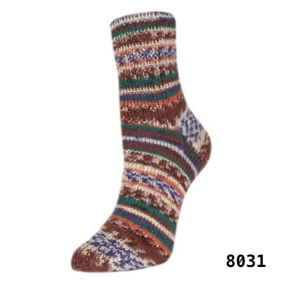 Flotte Socke Nordic 6ply is a colourful Jacquard sock yarn with earthy-toned patterns. At a DK weight gauge, we love thicker sock yarns like this for whipping up a quick pair. Great for boot socks, or, if you're like Amanda and Laura, bed socks!!
